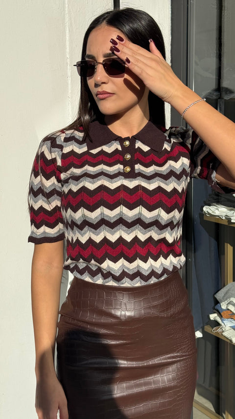 Maglia modello polo a mezza manica con bottoncini dorati. Tessuto viscosa ed elastane.