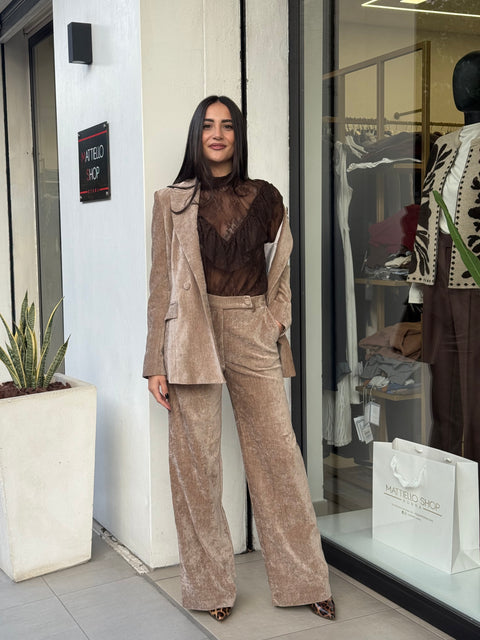 Tailleur in tessuto ciniglia composto da giacca doppio petto con applicazione di spilla sul bavero e pantaloni modello a palazzo.